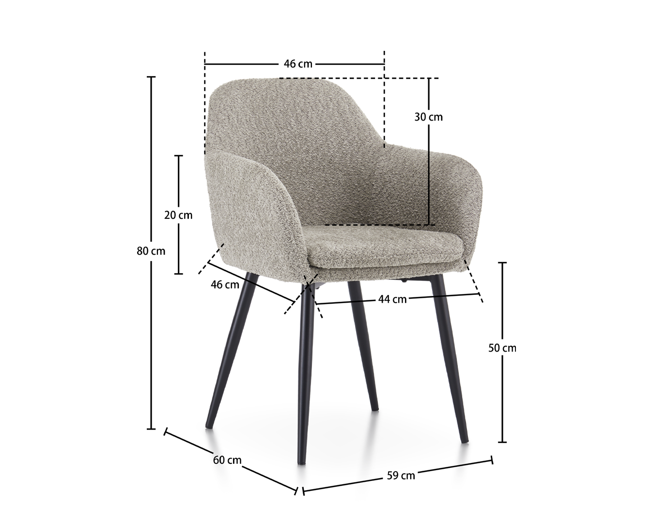 • Den ergonomiska designen säkerställer optimalt stöd, vilket gör den perfekt för långa middagar eller avslappnade måltider medan eleganta blackmetallben ger en touch av sofistikering och stabilitet och blandar sömlöst med alla dekor.