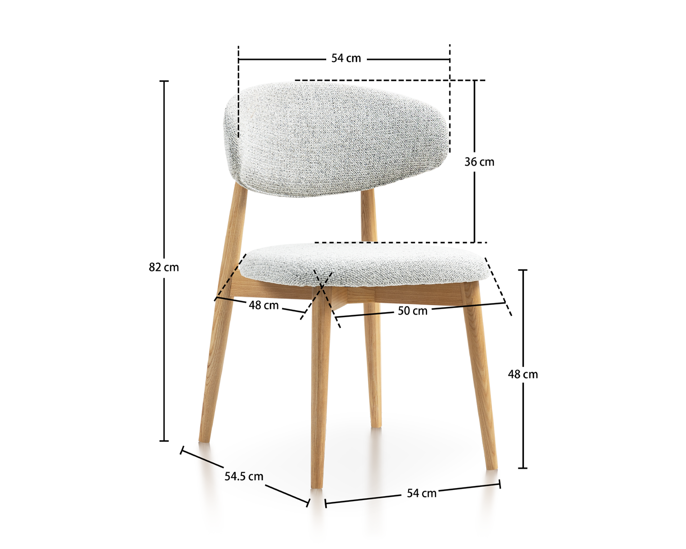 • Varje stol, som är utformad från Natural Ashwood, har unika kornmönster och färgvariationer, vilket lägger till dess karaktär och charm, samtidigt som den klädda sätet med mjukt tyg och svamp erbjuder en bekväm sittupplevelse.
